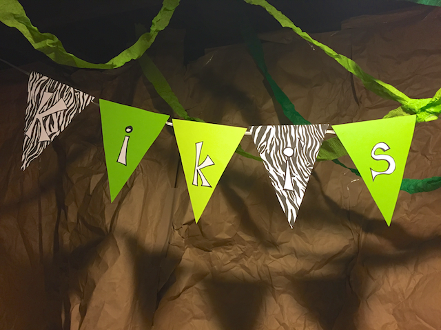 I then added a Dollar Store white and green table cloth to the wall to make the jungle scene extend on the wall a little!