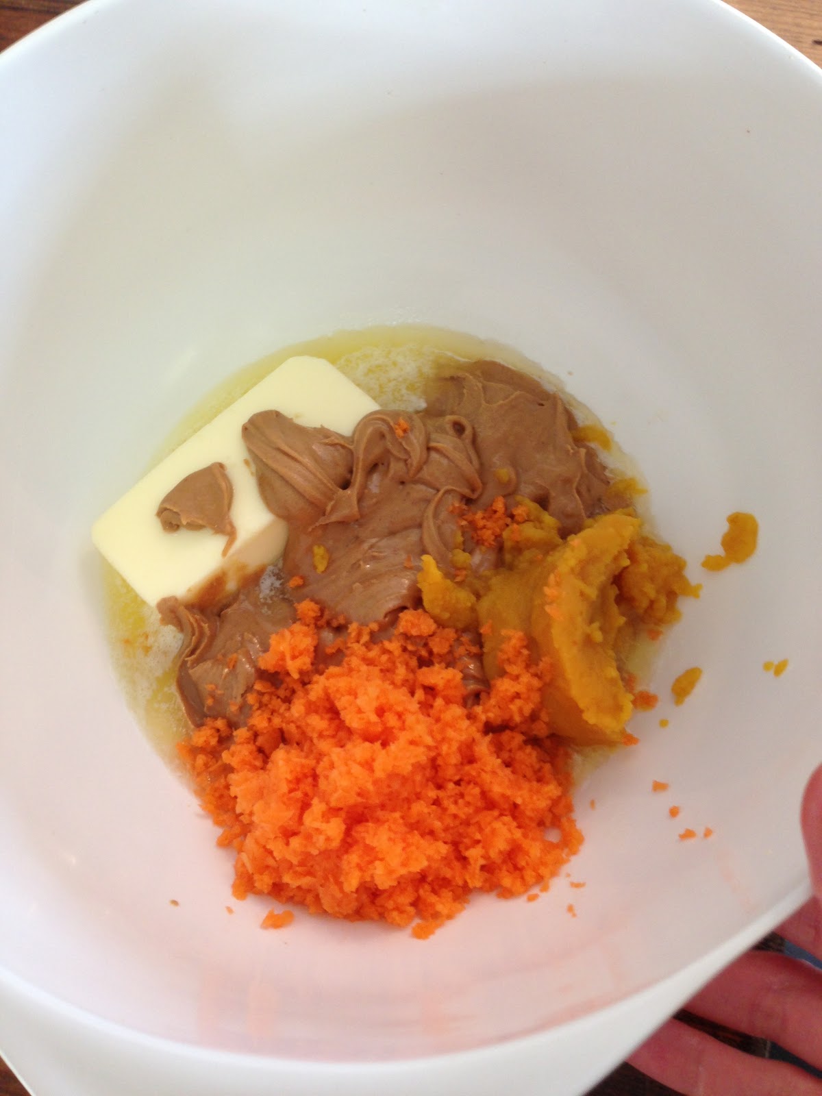 Beat together the butter, peanut butter, carrots, and pumpkin until well blended!