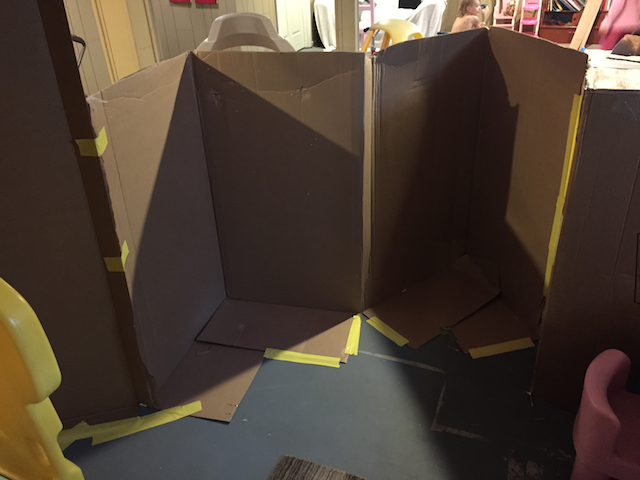 We opened up the boxes and used duct tape to tape the walls together and the cardboard to the floor!