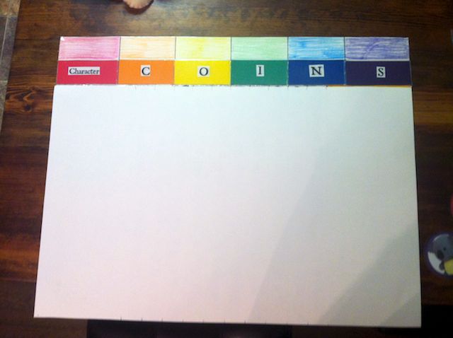 Here is my sons old chart which I got lucky and used to make my daughters new chart! You need to make pockets at the top of the chart for the coins to be placed in and pulled out by your child. I also laminated the front of the pockets labeled character, C, O, I, N, and S because if you just left them paper they would not be very sturdy for daily use! Once laminated, I just hot glued the edges down to make a pocket for the coins to fit into!
