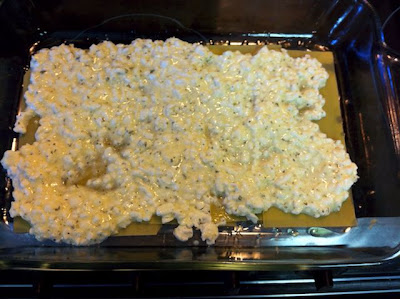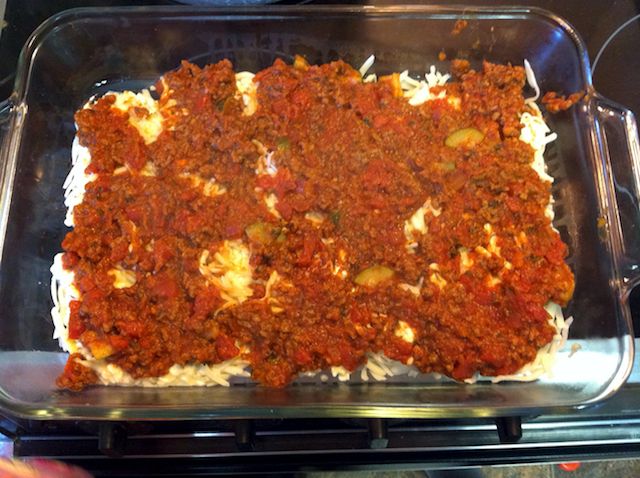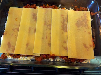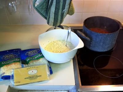 Lasagna simply means layers. Pictured below is all of your "layers". The next step is to layer in a regular 9X13 cooking pan. First its Lasagna noodles, cheese mixture, mozzarella cheese, and lastly meat sauce. You will most likely be repeating this three times.