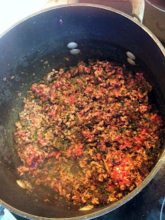 Now you are going to make your meat sauce. Cook the meat and veggies in a large pot.