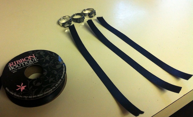 Now that you have three plain rings you need to cut three long pieces of black ribbon.