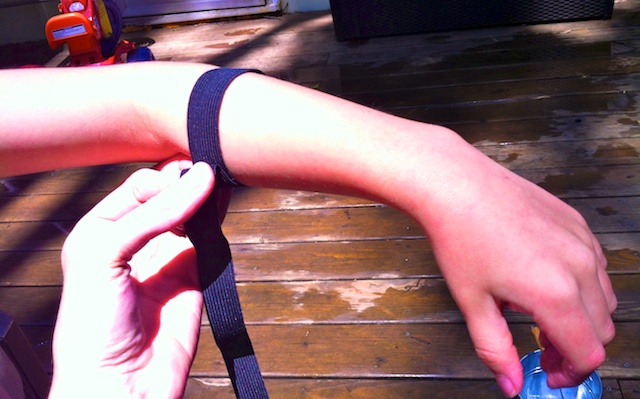 After you have all three circles of elastic sewn, put them on your child's arm and then measure out a strip of elastic that will connect all three together. This will also cover up your seems.